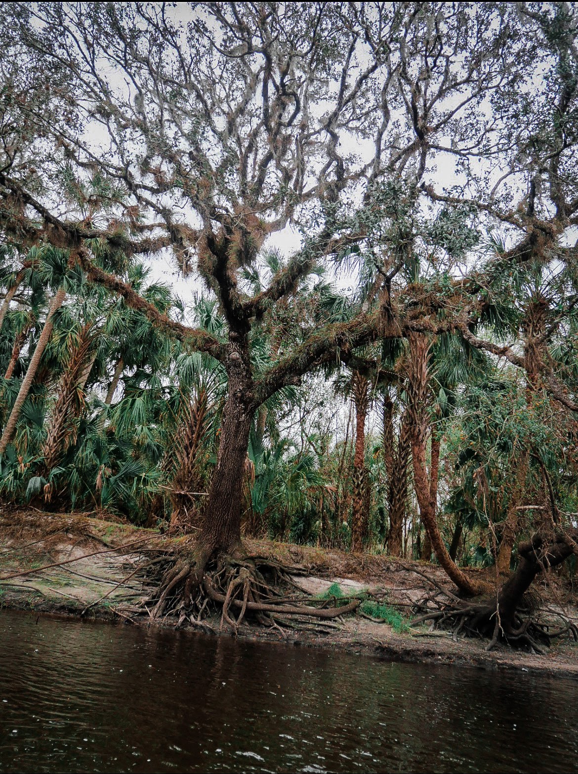 This is an oak tree spreading its roots in the river, surrounded by native Florida palm trees.